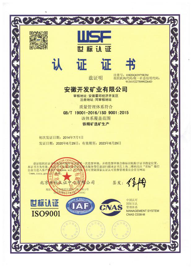 安徽開發(fā)礦業(yè)吳集鐵礦為磁選選礦,產(chǎn)品為磁鐵礦。質(zhì)量指標(biāo):TFe%≥66%,SiO2%≤7.5%,S%≤0.15%,P%≤0.02%,F(xiàn)%(細(xì)度)90~95。