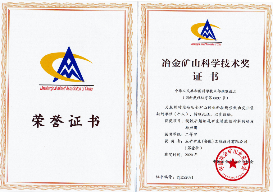 日前,由公司下屬五礦礦業(yè)(安徽)工程設計有限公司和安徽開發(fā)礦業(yè)有限公司聯(lián)合完成的“鏡鐵礦超細尾礦充填膠凝材料的研發(fā)與應用”成果,被中國冶金礦山企業(yè)協(xié)會授予“冶金礦山科學技術(shù)獎”二等獎,該獎項由中華人民共和國科學技術(shù)部批準設立。